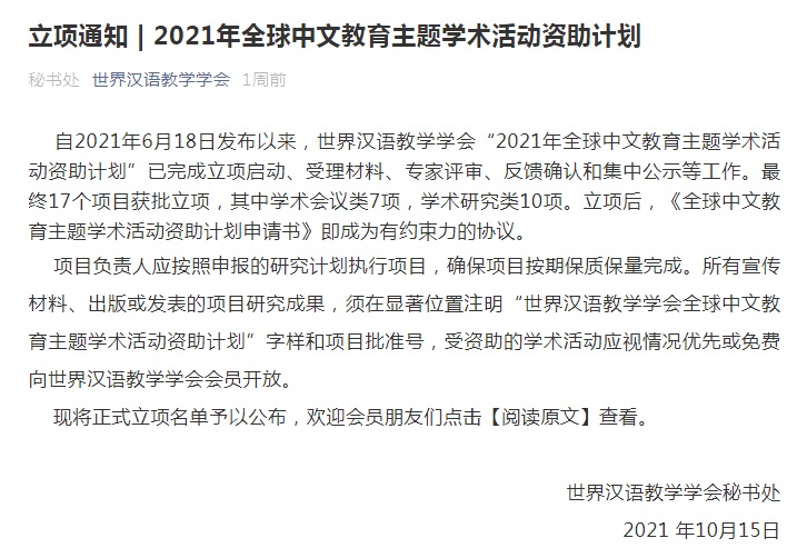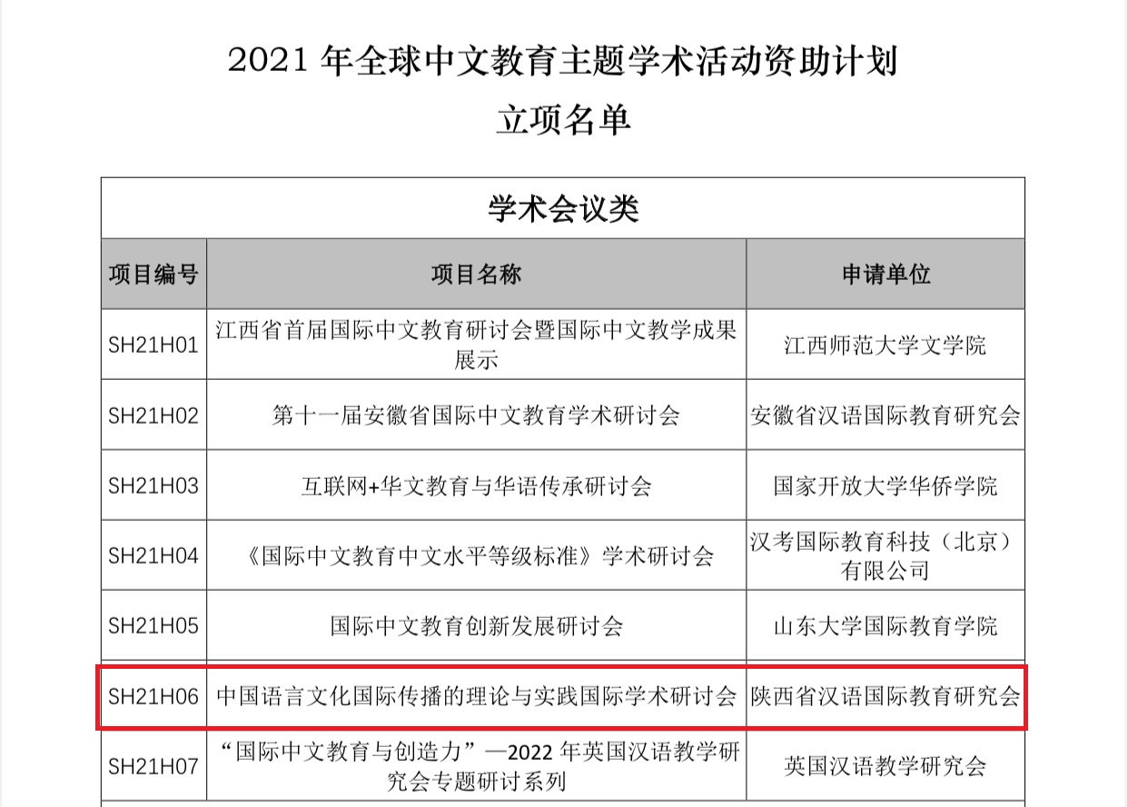 近日,世界汉语教学学会公布了“全球中文教育主题学术活动资助计划”立项名单,研究会申请的“中国语言文化国际传播的理论与实践国际学术研讨会”项目获全球中文教育主题学术活动资助(学术会议类),这是陕西省汉语国际教育研究会自成立以来首次获得世界汉语教学学会的研究项目。研究会将本着服务师生、服务学术、服务国际中文教育的原则,发挥责任感、能动性为各会员共享资源,为与会师生提供宽广的学术研究方向,打开广阔的学术研究视野。
