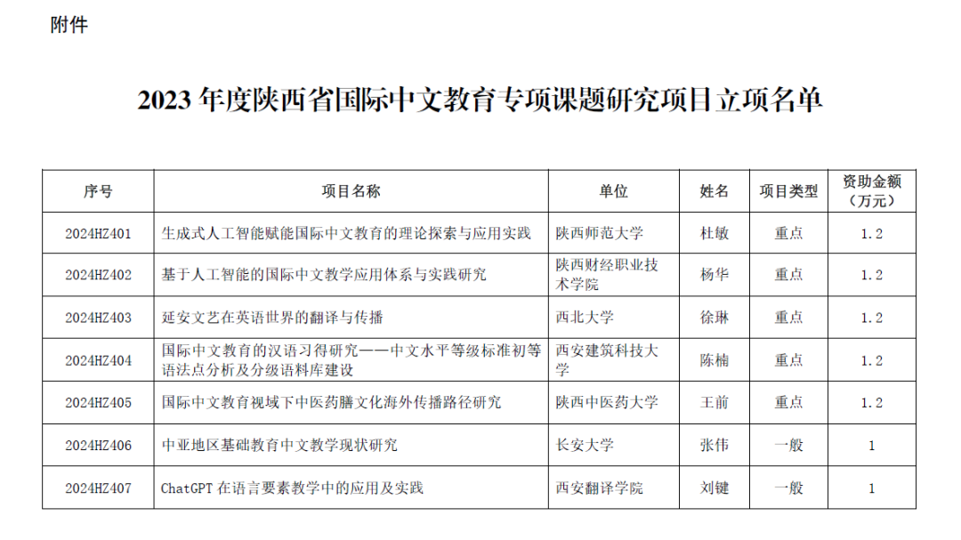一、2023 年度陕西省国际中文教育专项课题研究项目共立项25项,重点项目共5项,每项资助1.2万元;一般项目共20项,每项资助1万元(详见立项名单)。资助经费由省社科联在立项证书发放后一次性拨付。