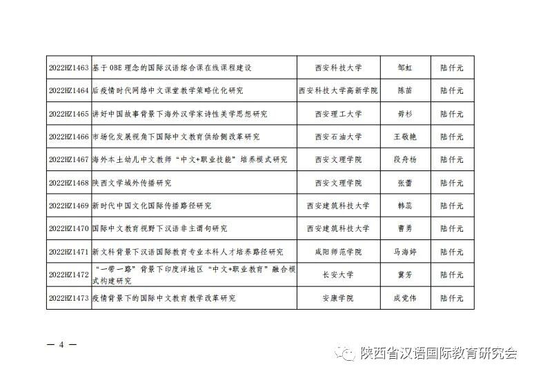 为推动我省汉语国际教育学科建设与发展,进一步提升该学科教师的科研能力,促进汉语国际教育学科学术繁荣,在陕西省汉语国际教育研究会的倡议及协调下,2022年陕西省社会科学界联合会与中文联盟/五洲汉风网络科技(北京)有限公司(以下简称"中文联盟")组织了2022年度陕西省汉语国际教育专项课题研究项目申报工作。经专家评审并报中文联盟、省社科联同意,确定立项25个项目。现将名单予以公告。